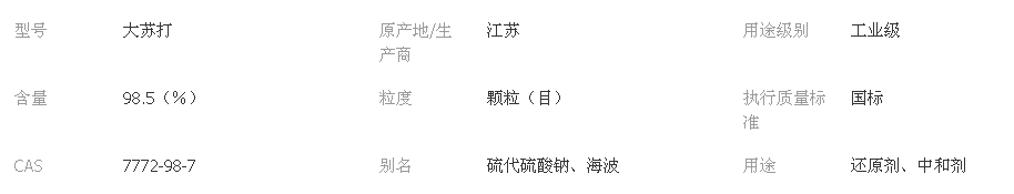 硫代硫酸钠,又名大苏打、海波、次亚硫酸钠。为单斜晶系白色结晶粉末,易溶于水,不溶于醇。用于分析试剂等,用途非常广泛。