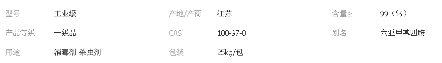 酚醛塑料电木粉,脲醛树脂以及铸造造型材料(覆膜砂)的固化剂、氨基塑料电玉粉的催化剂、木材工业,人造板及其制品等粘胶剂的固化剂,特别是脲醛胶水(粉)类的固化剂,橡胶硫化促进剂(H)、H发泡剂、固体燃料、油田助剂、是氯霉素中间体、氨基乙酸的主要原料。纺织工业中的防缩剂、食品加工的防腐剂、医药工业中利尿剂及尿道杀菌剂、农业杀虫剂的原料及防毒面具的光气吸收剂等。