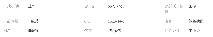 性 质:白色正交晶体;不挥发、不吸潮、无味无臭;常温时很稳定,能保持数年不变;易溶于水和液氨,在水溶液中呈强酸性;微溶于甲醇;不溶于乙醇和乙醚。具有氨基和磺酸基双官能团,能和多种物质进行化学反应。熔点205℃,分解温度209℃。